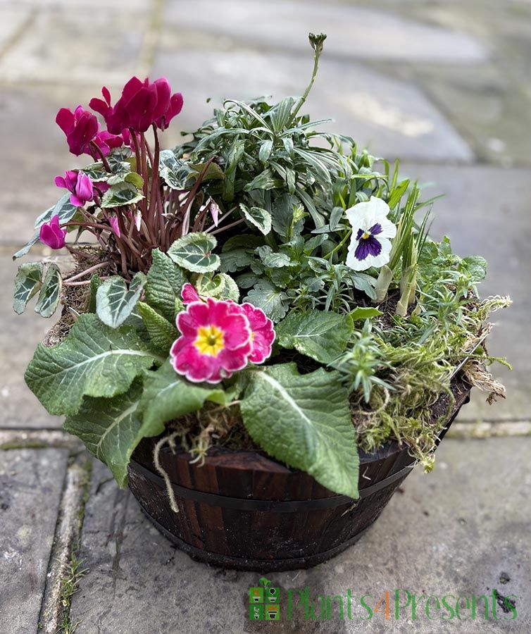 Always popular, these large barrel planters are freshly planted with long lasting bedding plants and they are looking really colourful again this week. The selection varies from week to week, but we are currently selecting 4 or 5 (depending on size) of the following hardy plants: locally grown dianthus, polyanthus, saxifrage, cyclamen, bellis, pansy, violas, erysimum, primroses, phlox, hyacinths, tete a tete, muscari, crocus and decorative ivy. These planters will look fabulous on a patio or doorstep and will bloom for several weeks.