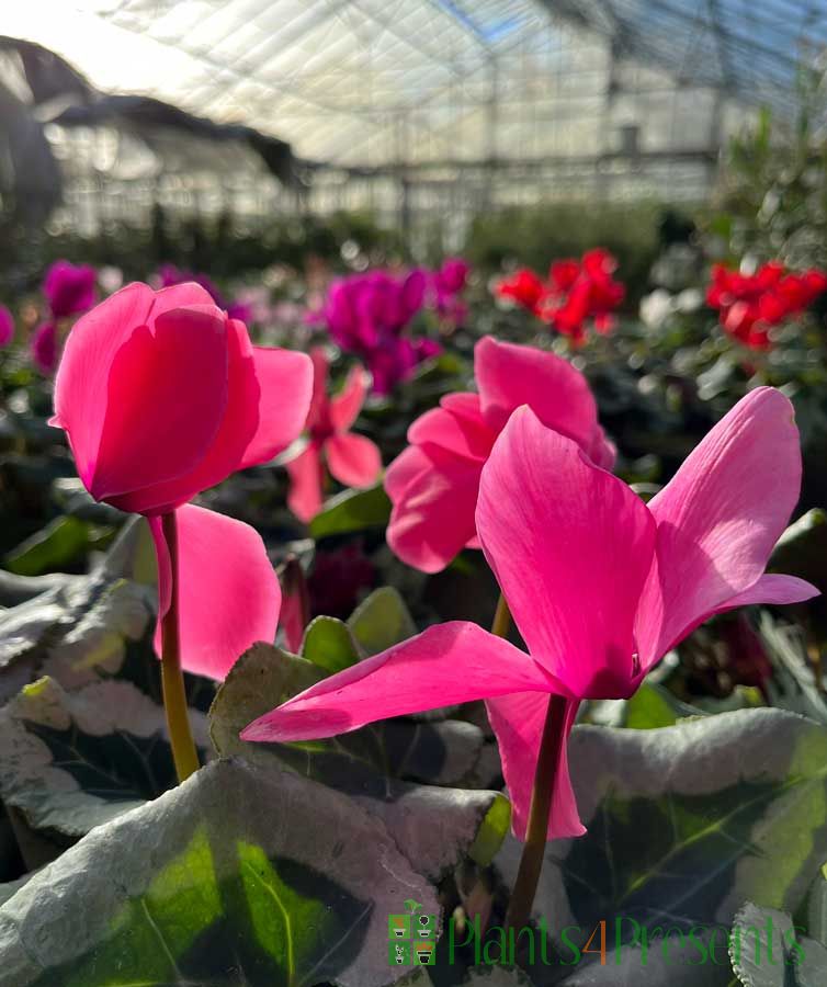 These stunning and substantial Sussex grown cyclamen have a very long flowering time when kept in a cool windowsill. They will put on a pretty display year after year during the short dark days.