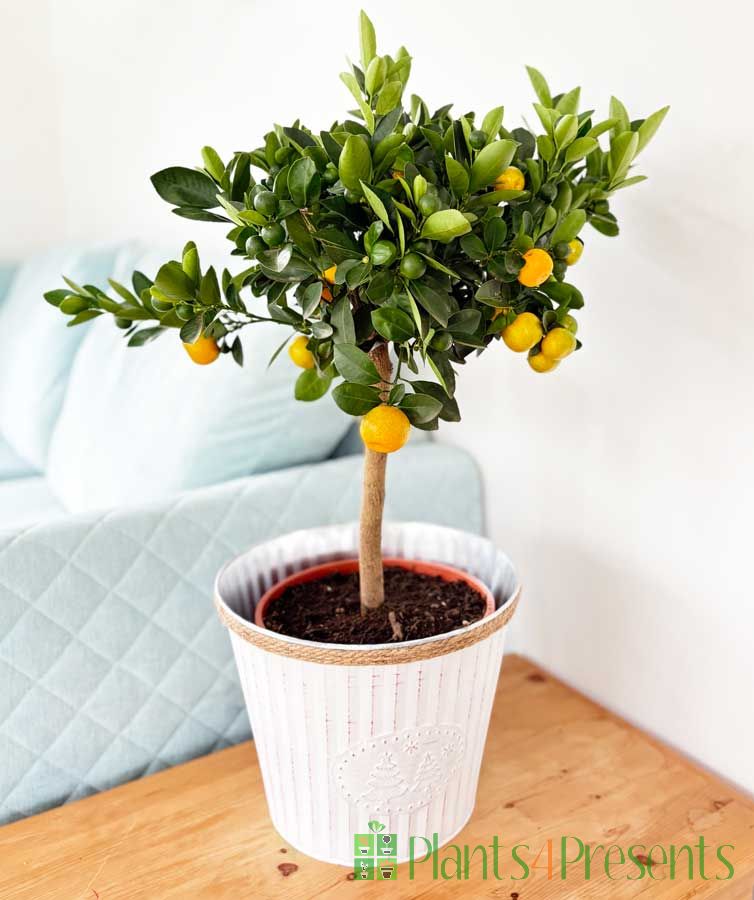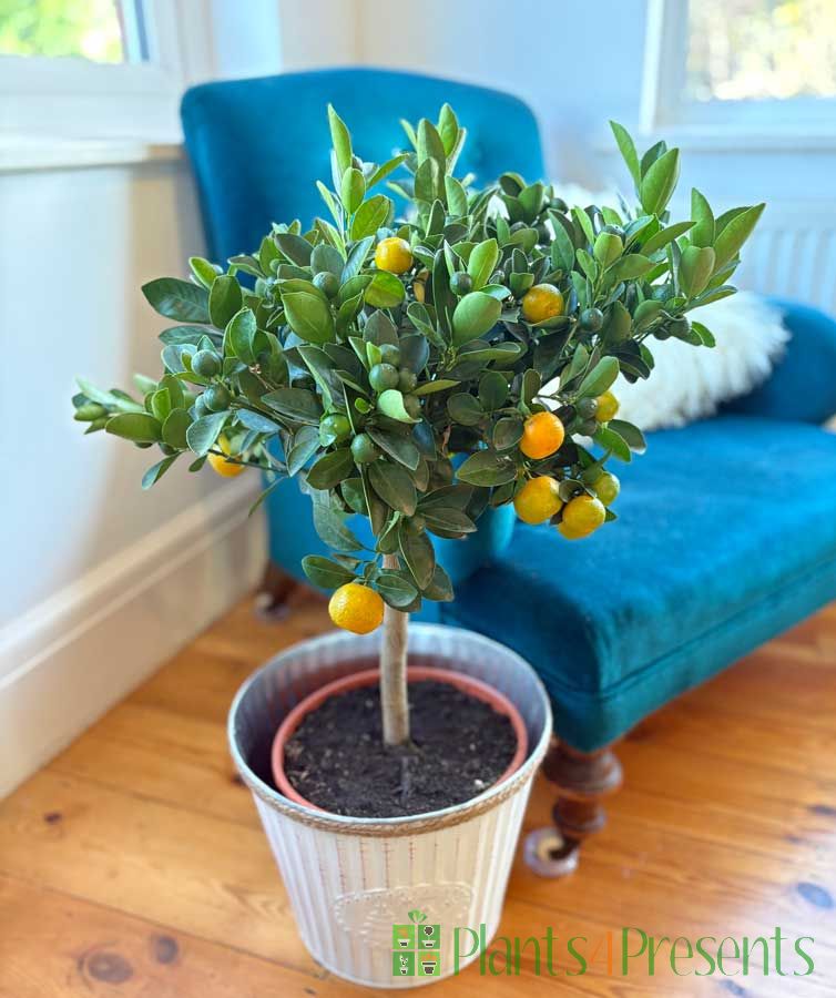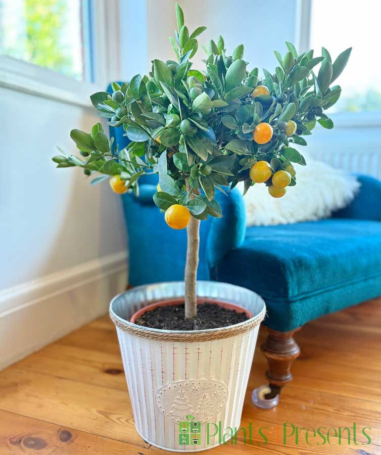 An excellent plant which arrived in very healthy condition with plenty of orange fruit. The tree is planted in a large 4L pot giving it plenty of room to get established plus a free grey coloured wooden barrel which really looks good with the plant inside it. Overall an excellent and very attractive buy and would certainly recommend Plant4Presents for quality and superb service.