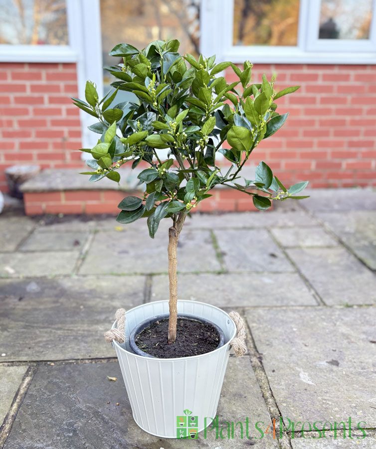 Like all citrus trees, these large sweet oranges like a sunny spot. In the winter that means a bright spot in the house near a window or patio door but in the summer once the night time temperature is above 5C they will also look great on a sheltered patio.