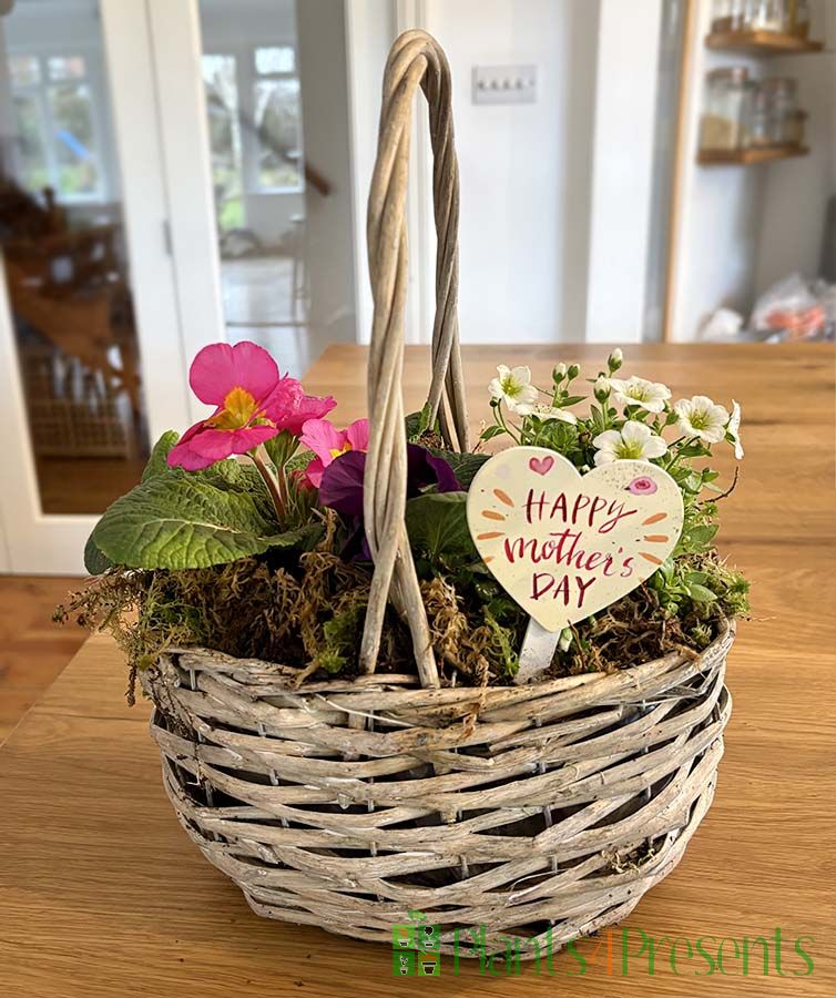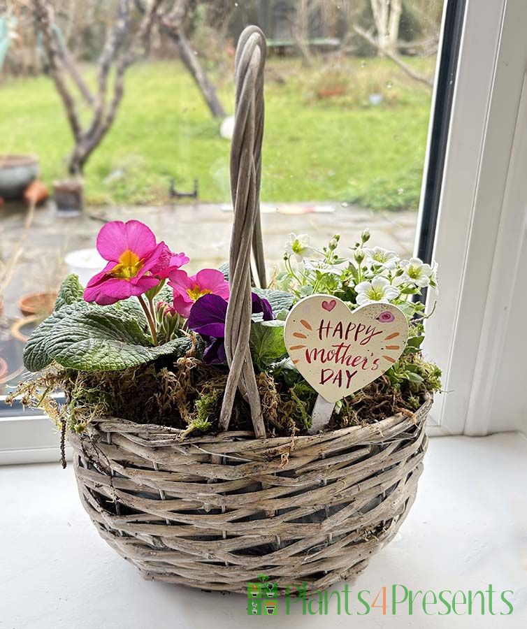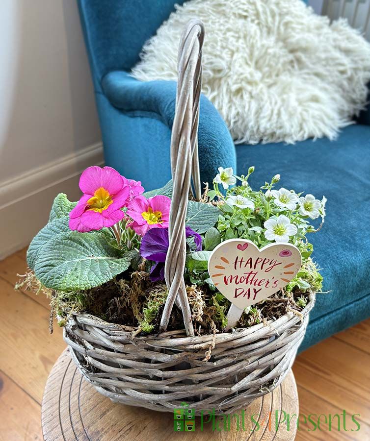 Perfect for a cool windowsill or table top, each basket contains at least 3 British grown seasonal plants from a selection including saxifrage, primroses, bellis, tete a tete, muscari, hyacinths and dianthus. They'll continue to flower for weeks on end, reminding mum that you are thinking of her over and over again.