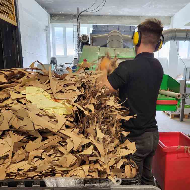 Clean cardboard is carefully sorted and shredded, ready to be made into new products