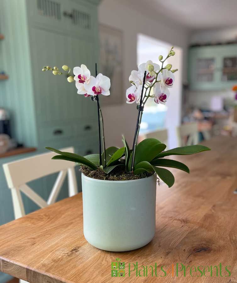 British grown, small flowered orchids, also known as Phalaenopsis are beautifully presented in a stylish modern ceramic planter. Great gifts for a modern home, they will bring a touch of class all year round.