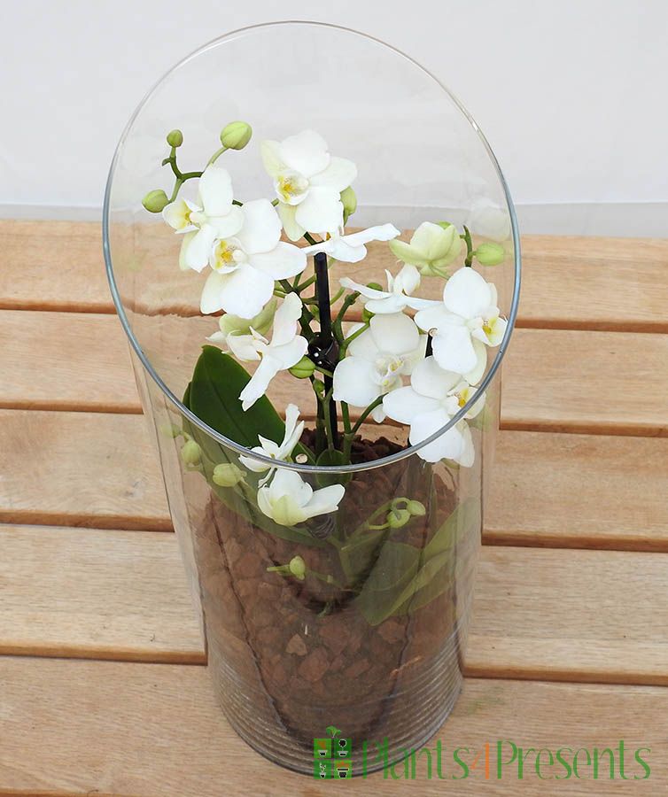 British grown, small flowered orchids, also known as Phalaenopsis are beautifully presented in a stylish glass terrarium. Great gifts for a modern home, they will bring a touch of class all year round.