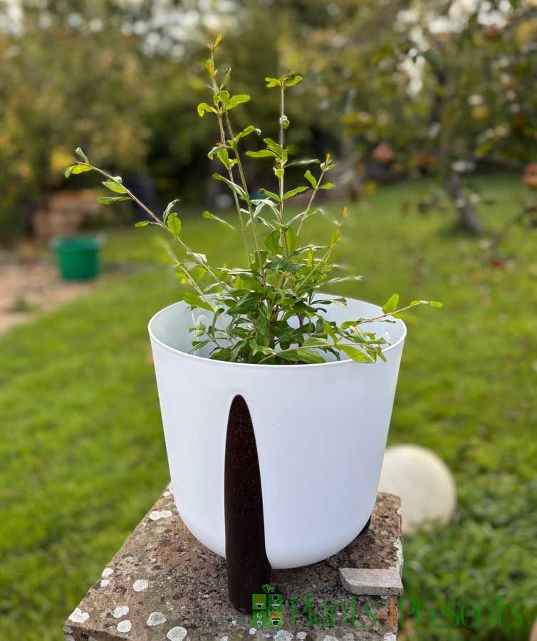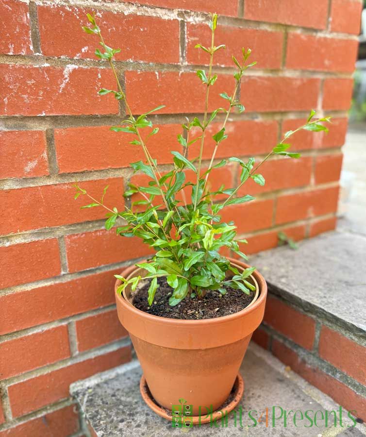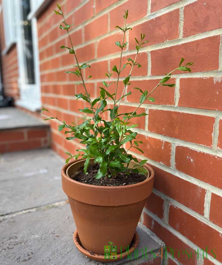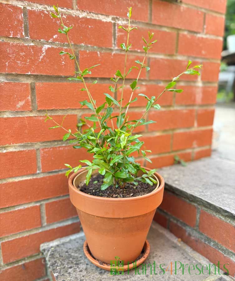 A dwarf variety, your pomegranate will eventually reach a maximum height of 2m tall. They can be planted out in the garden after the first year but will crop better indoors as long as they get enough sunlight on the leaves. If you prefer to keep it in a pot it is a good idea to prune your plant back at the end of the summer and repot it next spring to keep it nice and bushy.
