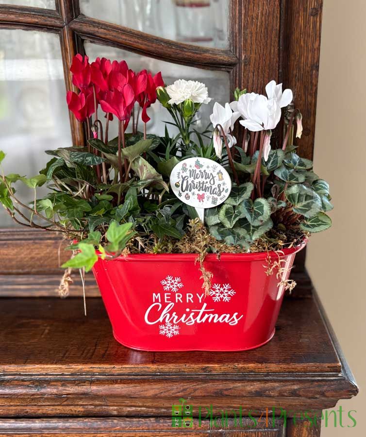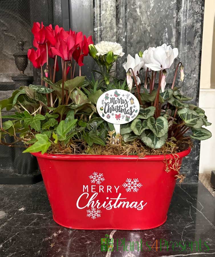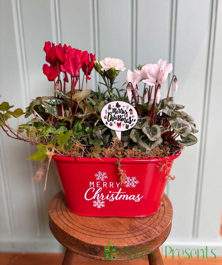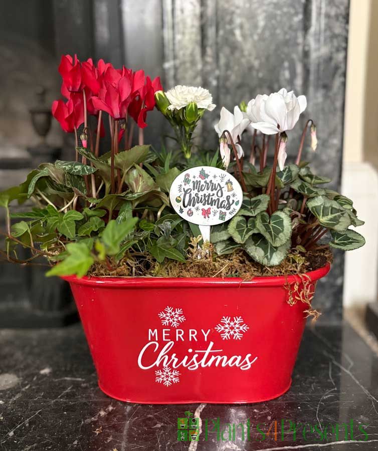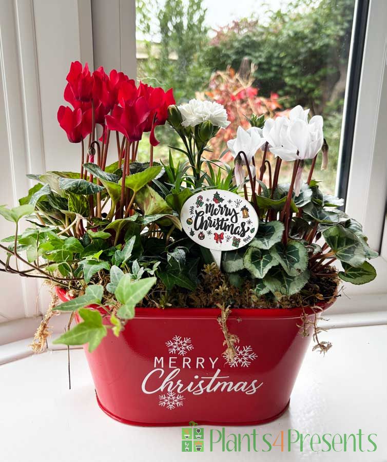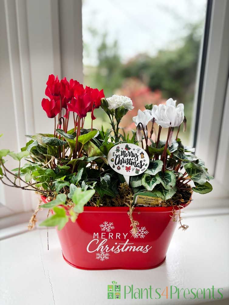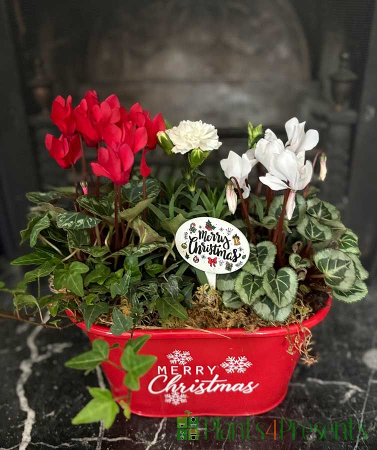 Each planter includes at least 4 top quality red or white flowering plants from a selection including cyclamen, dianthus, violas, ivy and from December onwards, mini poinsettias and polka dot plants.