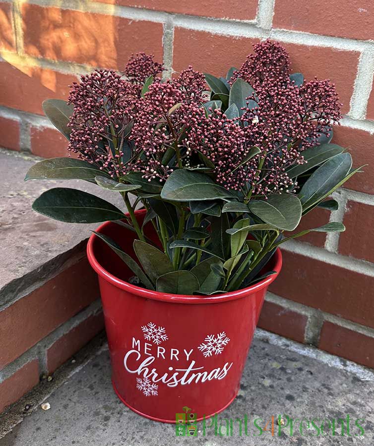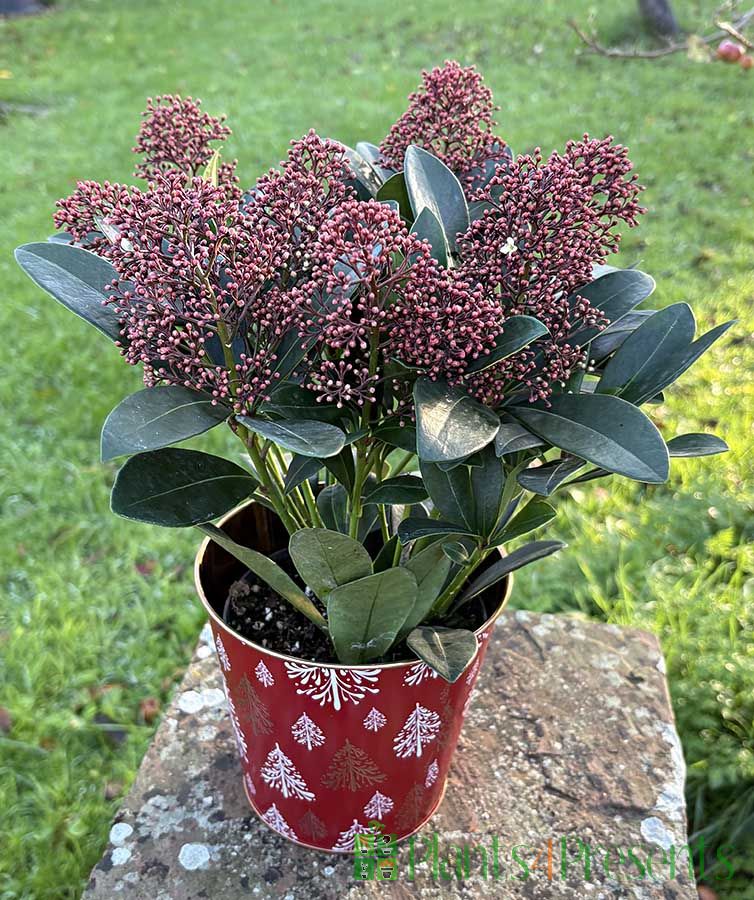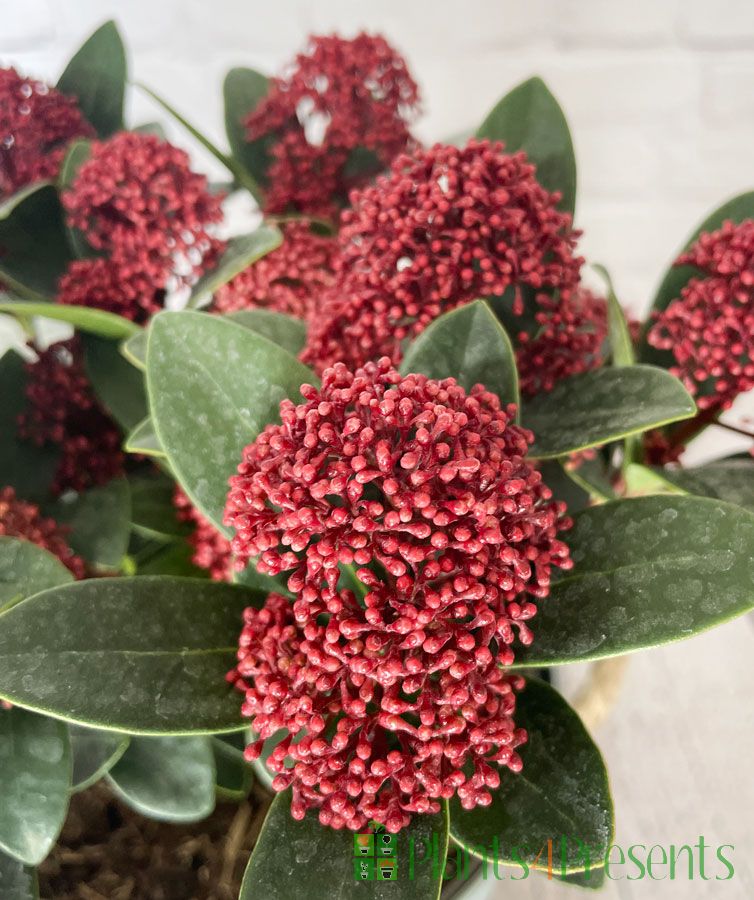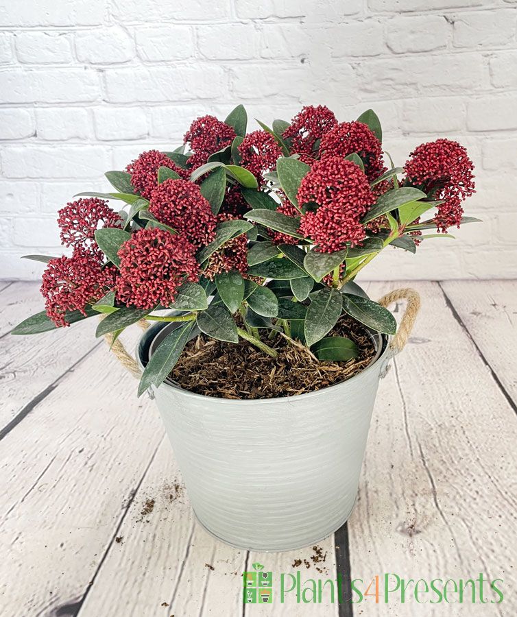 Skimmias are hardy outdoor plants that like woodland conditions – deep fertile soil and a bit of shade. However, if you don’t want to plant it out straight away, your Skimmia can also be kept in a container on a patio.