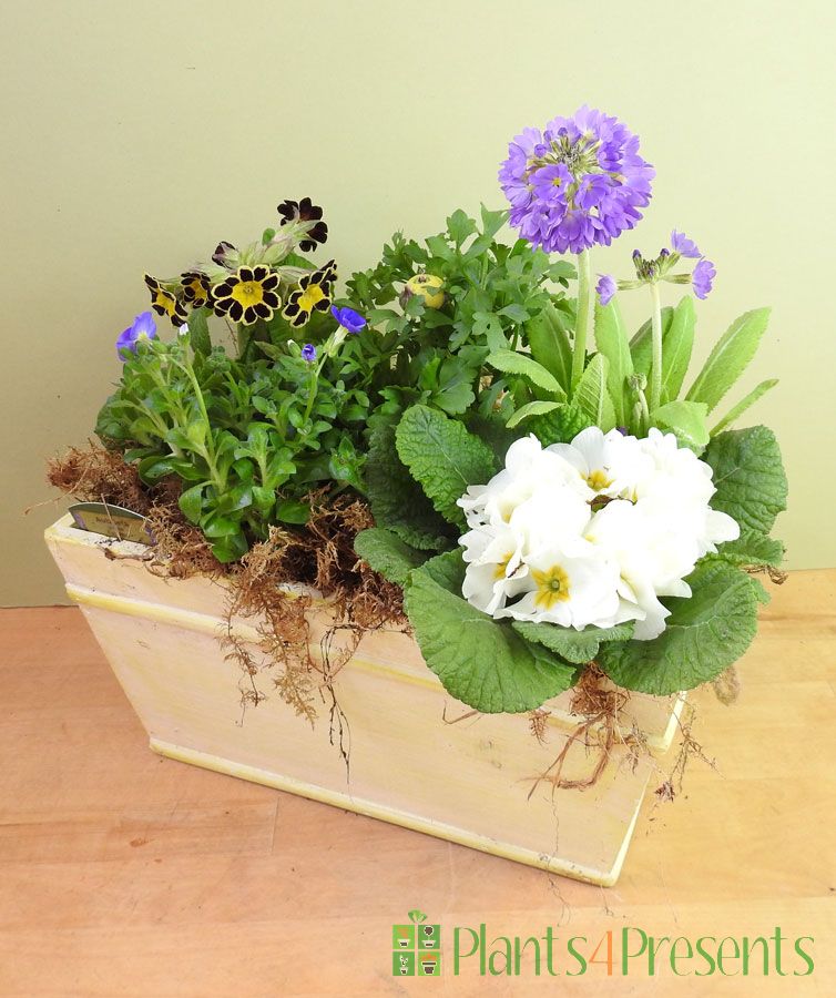 Delivered with a bright mix of colours in bud and bloom in an attractive pale yellow wooden trough, these planters include seasonal plants looking their prettiest. Because we make these planters up fresh each week at the nursery the exact selection does vary but they will always look floral and colourful.