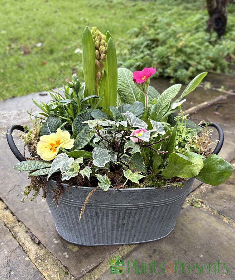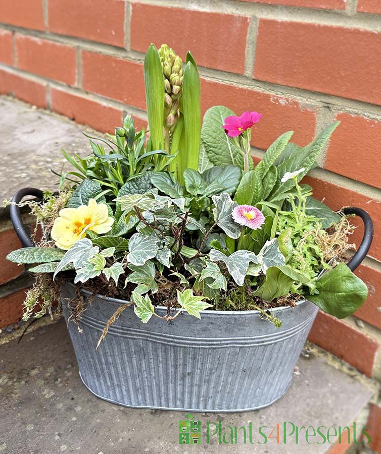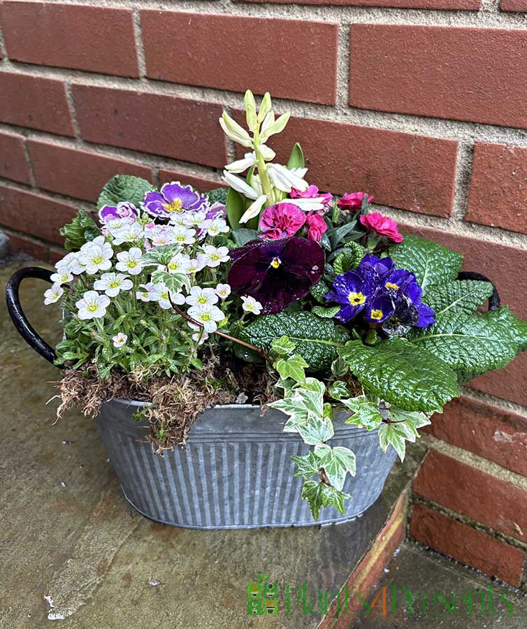 Our large spring tin planters are a great way to brighten up any outside space. Containing a number of beautiful seasonal plants that have are bud and bloom ready, a large spring tin planter will add colour and interest to any outdoor space.