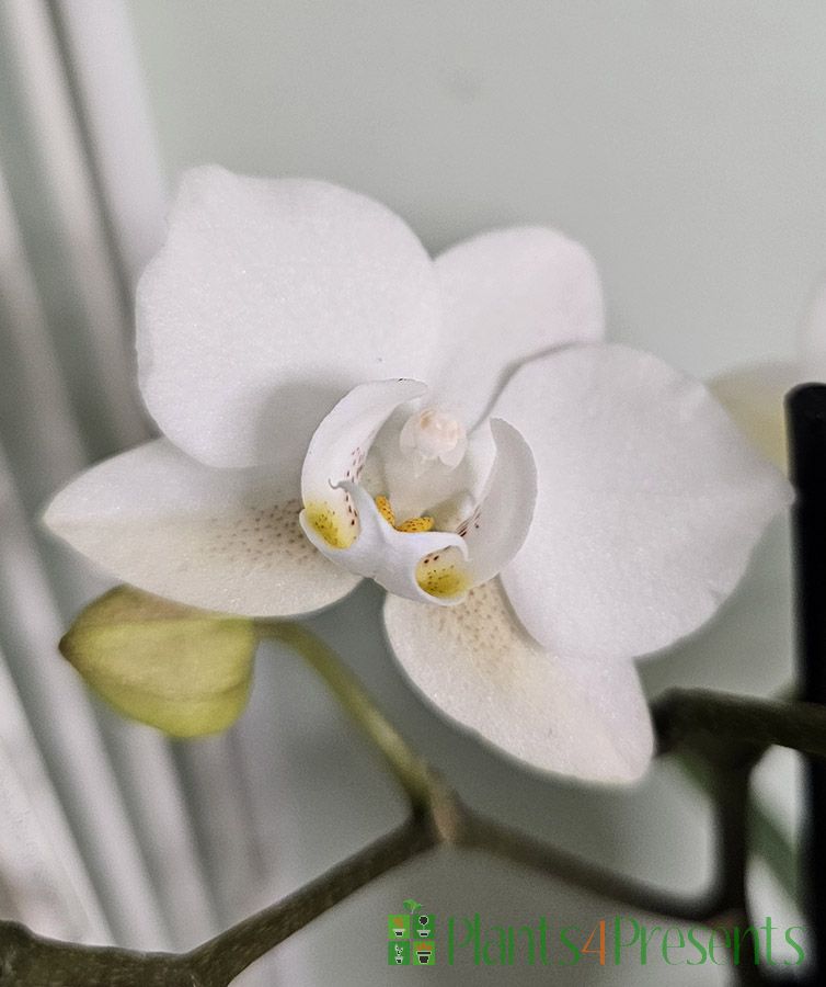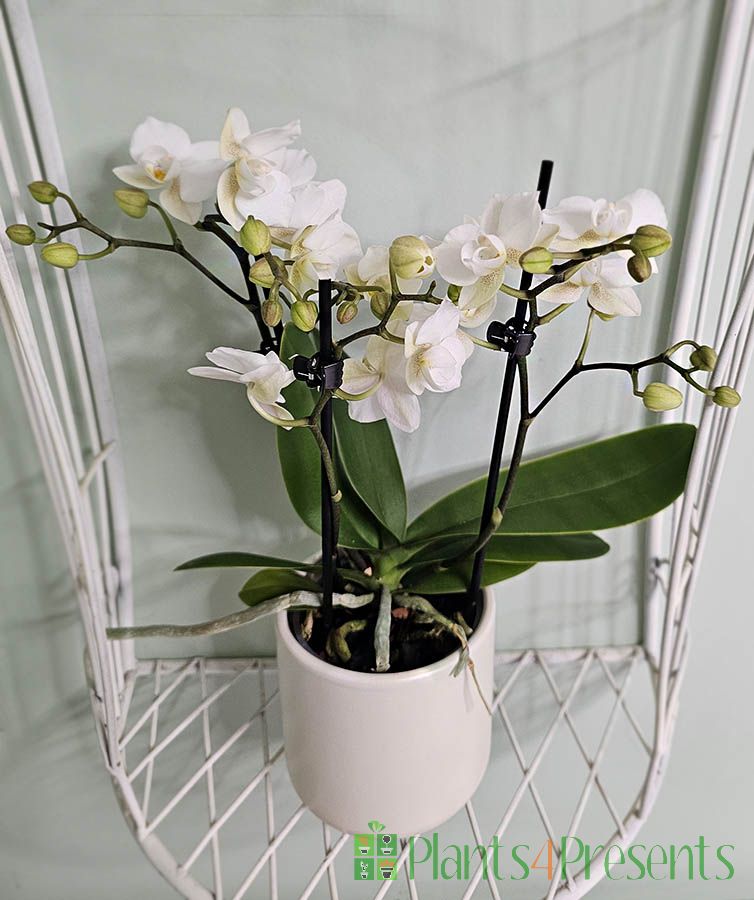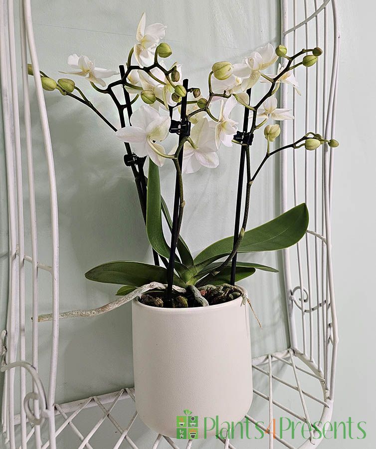 These stylish orchids will be presented in a choice of grey or green coloured ceramic pots. In the meantime the plants themselves are as pictured with 3 stems and a whole host of delicate white flowers and flower buds to come.