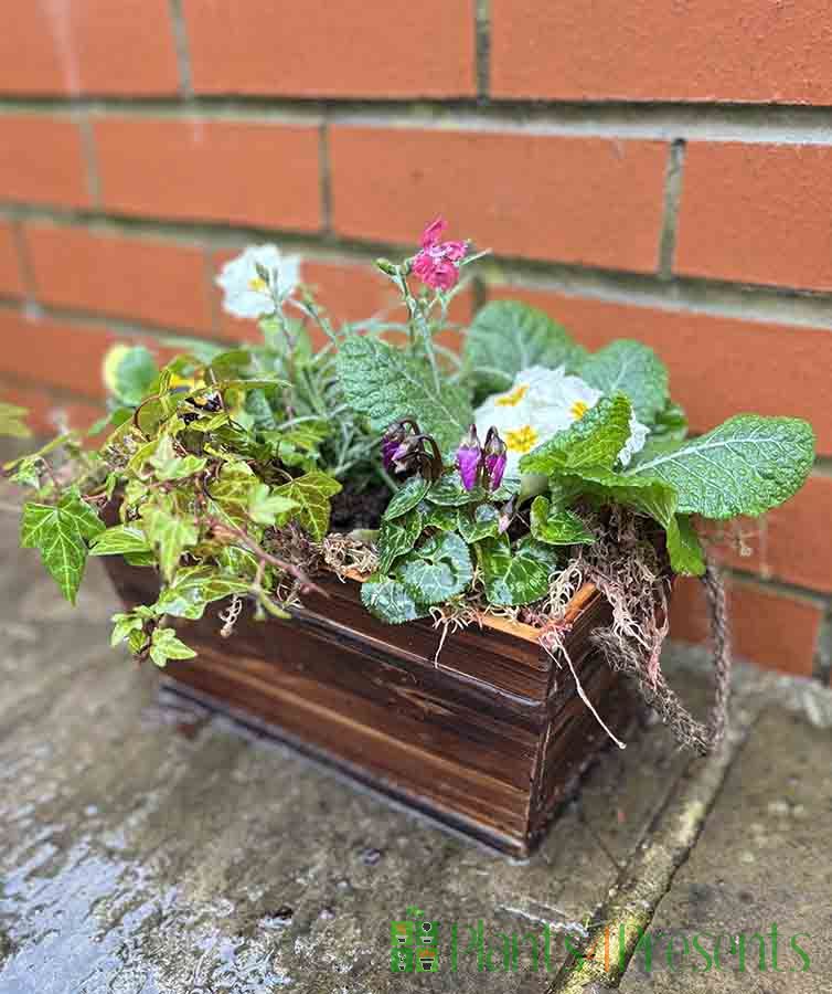 Delivered with a bright mix of plants in bud and bloom all set off by an attractive dark wooden trough. These planters include seasonal plants looking their prettiest. Because we make these planters up fresh each week at the nursery, the exact selection does vary from week to week but they will always be nice and colourful.