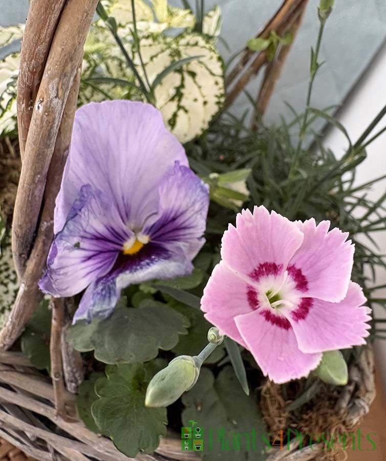 Because these planters are made up fresh in the nursery each day by our planter queen there will always be a bit of variation from week to week but they'll always include a nice fresh collection of long flowering plants in bud and bloom. At the moment we're using colourful dianthus, polka dot plants and violas but we may also use, polyanthus, cyclamen, bellis, pansy, phlox, hypoestes, kalanchoe and other nice seasonal plants to complete the display.