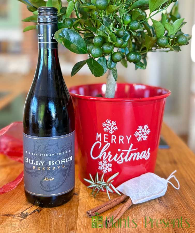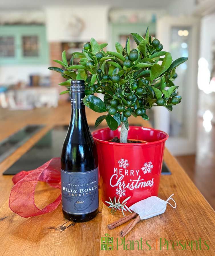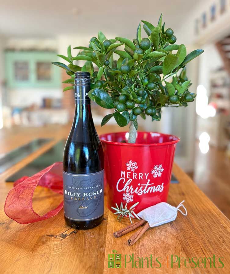 This is a really super gift set for the dark winter evenings. The calamondin are nice and bushy plants with masses of ripening green fruits and the fresh mulling spices are tied up in an attractive pouch and accompanied by a full-size bottle of tasty Billy Bosch wine - perfect for warming up on a cold evening.